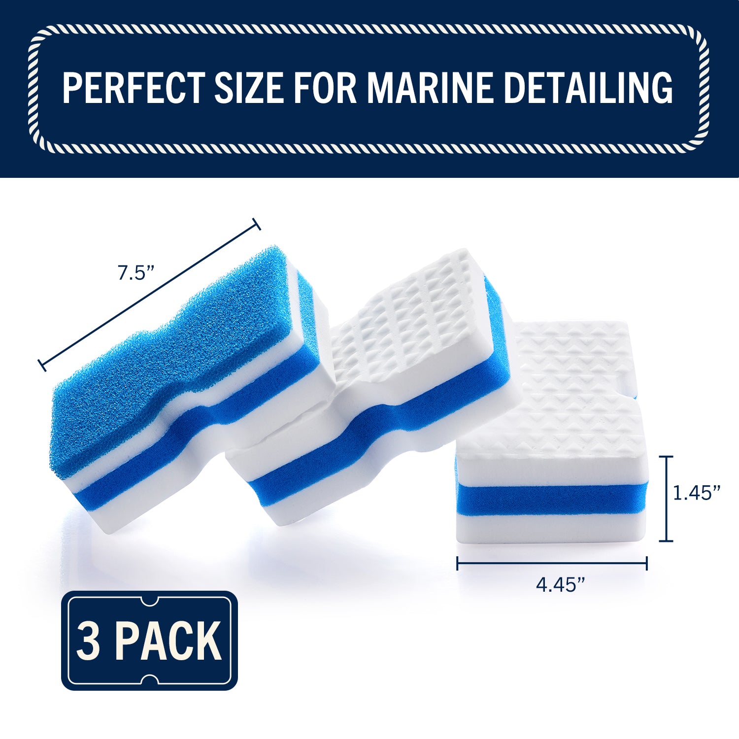 - Reinforced Core for Tough Cleaning. Each boat sponge is crafted from dense, marine-grade melamine with a reinforced blue core, so it won’t crumble like ordinary sponges. The white areas feature a textured pattern designed to lift grime and grease more effectively with every swipe. Ergonomic finger cut-outs keep your grip steady while you power through tough spots, an essential upgrade to any boat cleaning kit or boat detailing kit.