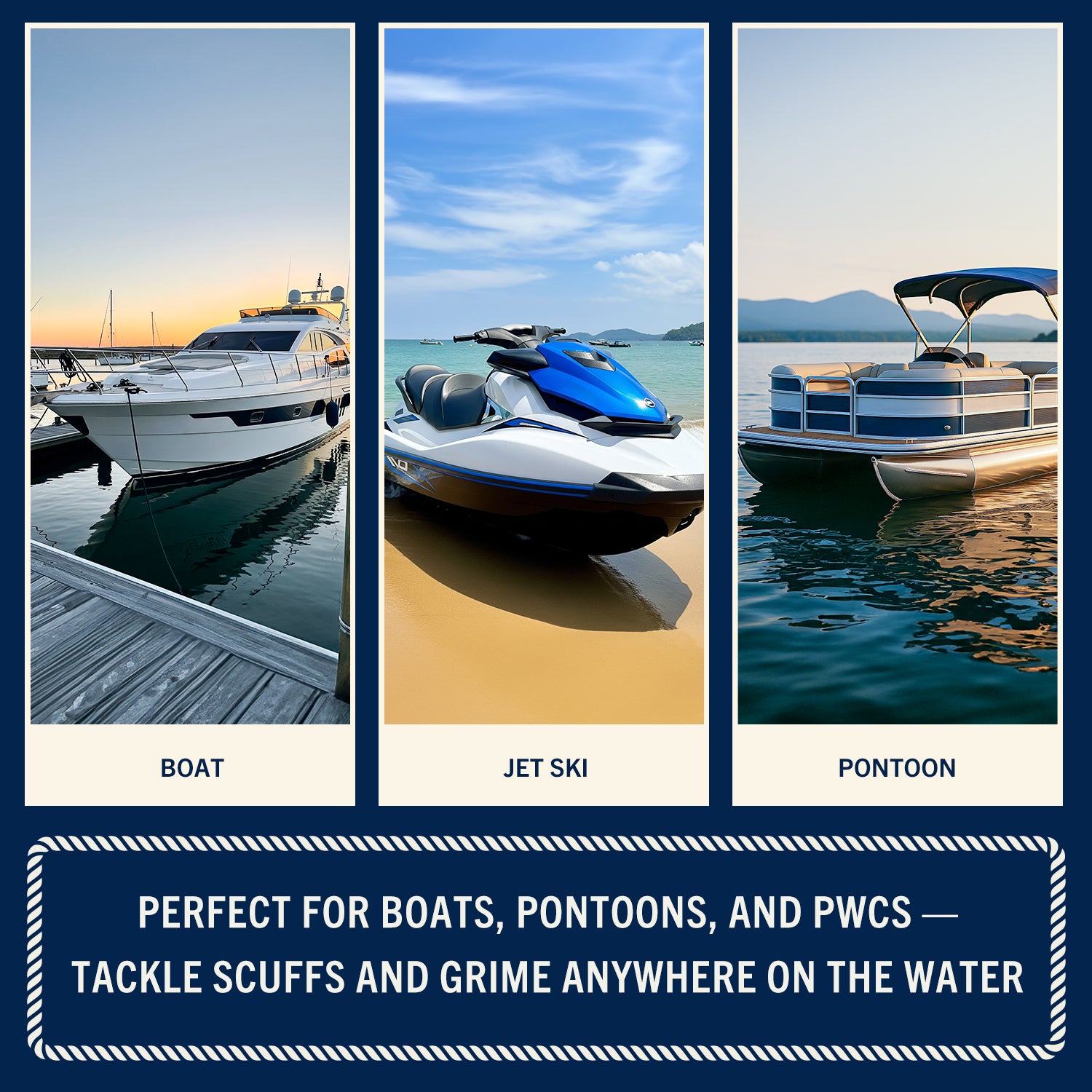 Safe for use on fiberglass, aluminum, plastic, vinyl, and gelcoat, these erasers are a trusted option among boaters looking for a scratch-free clean. They work well as a boat hull cleaner, including as a hull cleaner for fiberglass boats, and also serve as a convenient marine vinyl cleaner while on the water.